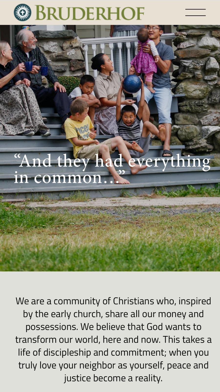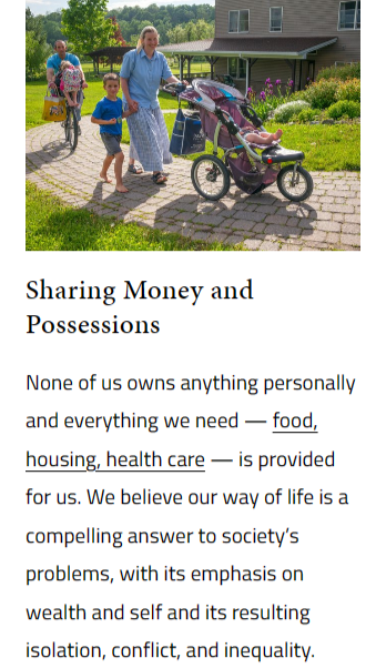 The Bruderhof is a group that lives together in community and shares all their possessions and money. Every member of the community is taken care of regardless of ability and all contributions are valued. They describe themselves as “a community of Christians who, inspired by the early church, share all our money and possessions. We believe that God wants to transform our world, here and now. This takes a life of discipleship and commitment; when you truly love your neighbor as yourself, peace and justice become a reality.”