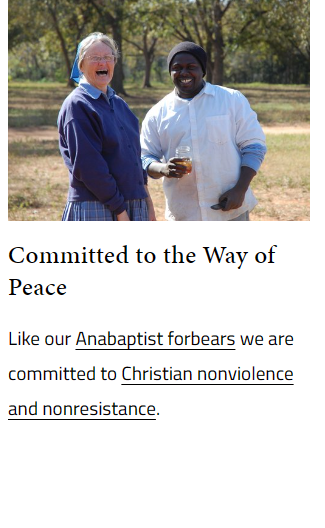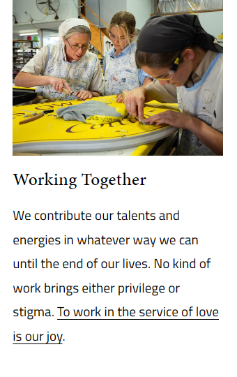 Through conversations with members, we learned that the Bruderhof sees their role as being a “light on a hill”. For this reason, they focus internally on how their own community can be a light. They have values including non-violence and anti-capitalism. They live these out in their daily lives by refusing to use violence or aid any military and by turning over all personal belongings to be shared by the community. However, they do not see it as their calling to take direct action against violence and exploitation in the world.